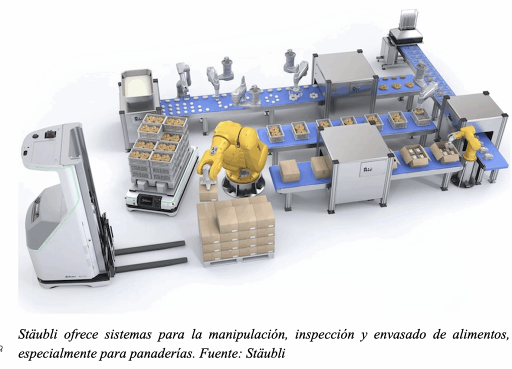 mi traduci in inglese in modo fluido senza schematizzazione? Enfrentará la industria de panadería, en 2025, retos esenciales: necesidad de estándares más altos de higiene, escasez de mano de obra y demandas del cliente que cambian. Para abordarlos, Stäubli Robotics está promoviendo la automatización específica de los procesos de horneado, incorporando robótica e inteligencia artificial en tareas como el control, la categorización y el manejo cuidadoso de productos recién horneados. Robots diseñados para entornos alimentarios Stäubli ofrece robots de 4 y 6 ejes, así como AMRs, con diseño higiénico ideal para entornos húmedos e inmersivos (serie HE). Estos robots –compactos, sin cables expuestos y fáciles de limpiar– soportan lavados intensivos, cumplen con estándares de seguridad alimentaria y encajan en líneas de producción exigentes sin comprometer productividad o calidad. Inspección automatizada con visión avanzada Stäubli exhibió en la exposición IBIE 2025 (Las Vegas) el modelo TS2-60 HE, que se combinó con la solución de visión AI de Oxipital (VX2). El robot toma panecillos de un contenedor, los inspecciona con visión computarizada de alta precisión, separa los defectuosos a una tolva y traslada los aceptados a la línea. Con la tecnología de seguimiento por visión VALtrack, el ciclo regresa al punto de partida para ser reciclado, lo que permite un proceso automatizado, efectivo y cerrado. Aplicaciones versátiles en panificación industrial La solución abarca varios procesos: porcionado, inspección de calidad, clasificación, decoración, paletización y pick-and-place. Permite que panaderías reaccionen de forma rápida a nuevas recetas o solicitudes estacionales, ya que está hecha para cambios veloces de producto. Estrategia colaborativa con Oxipital AI La alianza entre Stäubli y Oxipital AI fortalece el uso de robots alimentarios con visión autónoma. Esta simbiosis garantiza inspección confiable de productos, reducción de errores humanos, mejora en la trazabilidad y mayor capacidad de producción. Stäubli está liderando la transición hacia una panadería automatizada, precisa y flexible. Robots como el TS2-60 HE, aliados con visión AI (Oxipital) y software de tracking (VALtrack), automatizan inspección y manipulación, mejoran la calidad y reducen riesgos operativos. Esta automatización es una respuesta directa a los desafíos actuales: seguridad alimentaria, eficiencia y adaptabilidad. Cada vez más panaderías abrazan esta solución para mantenerse competitivas en el siglo XXI.